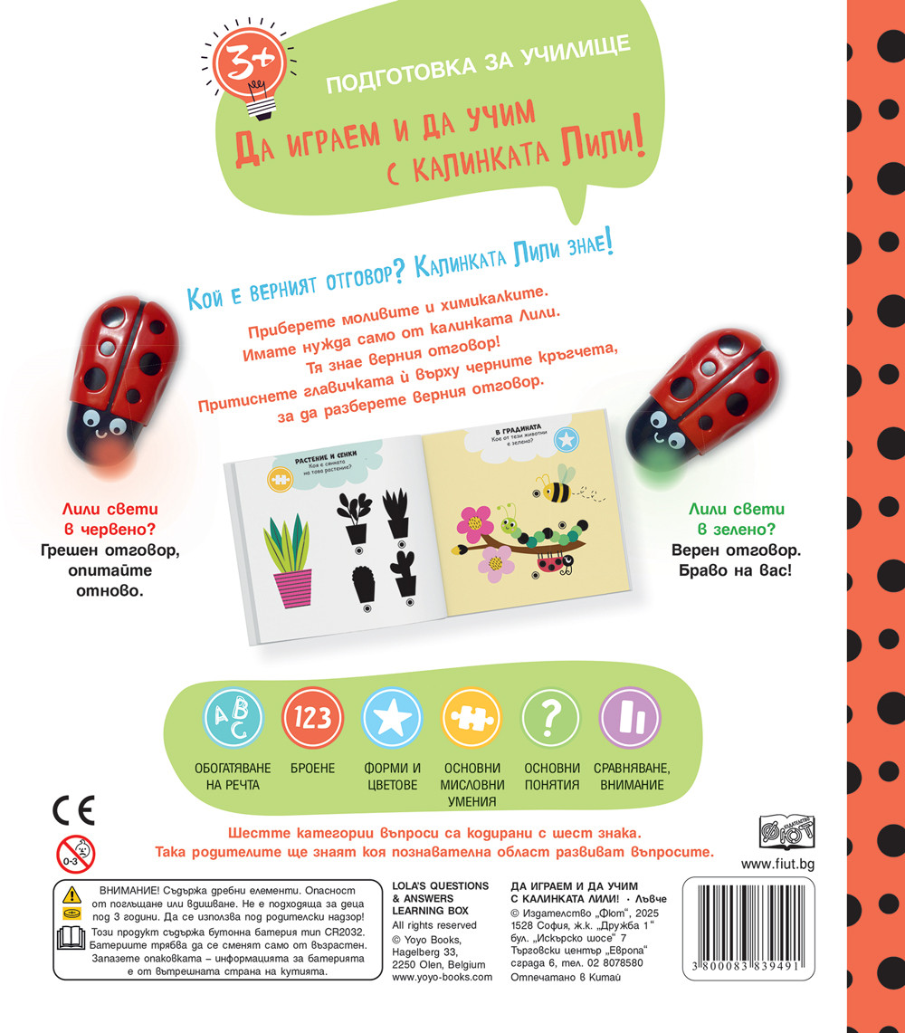 ДетайлиКой е верният отговор? Калинката Лили знае! Притиснете главичката й върху избрания отговор и ще разберете дали е верен или грешен. Шестте категории въпроси са кодирани с шест знака. Така родителите ще знаят коя познавателна област развиват въпросите.