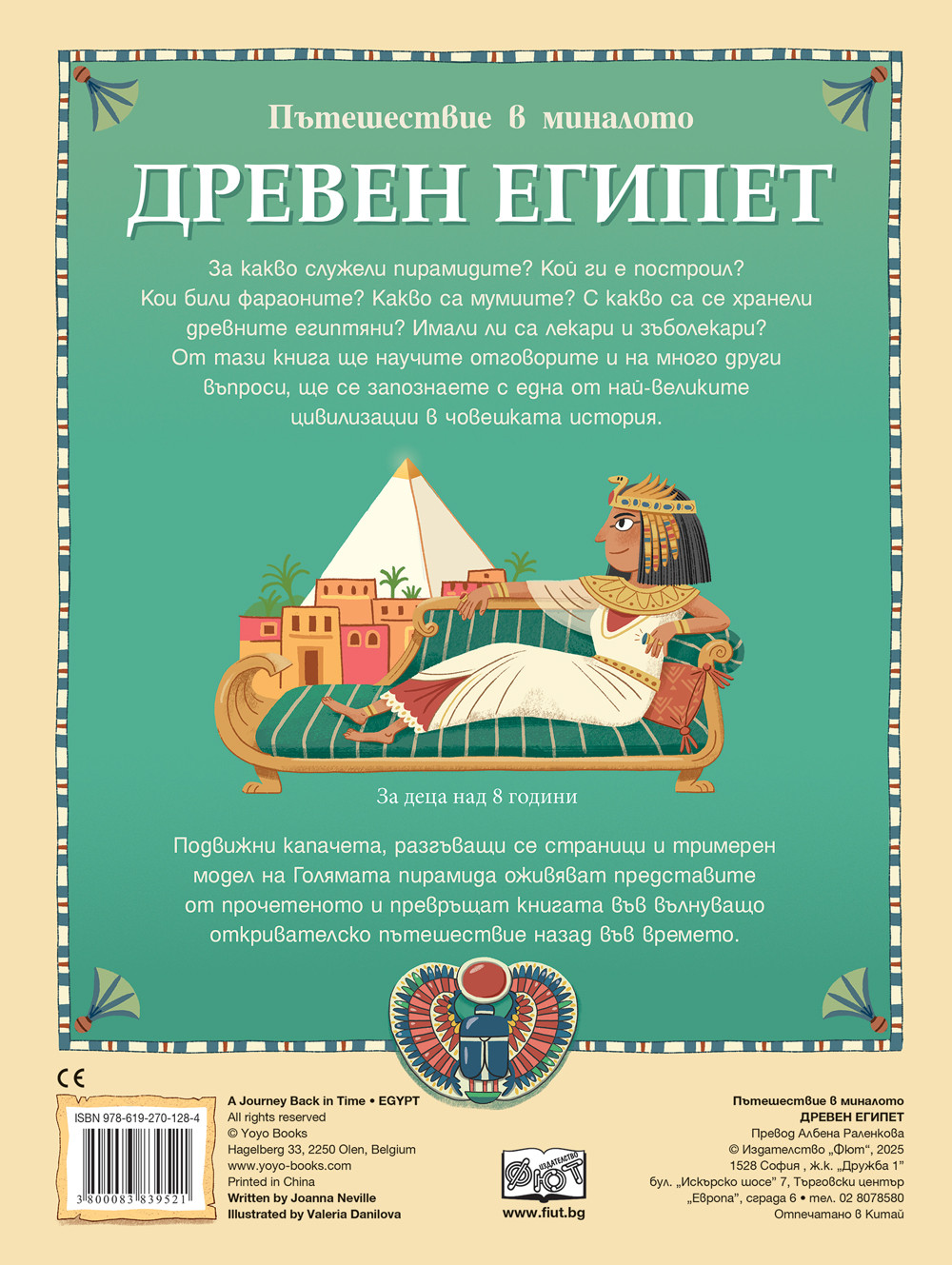 Подвижни капачета, разгъващи се страници и тримерен модел на Голямата пирамида оживяват представите от прочетеното и превръщат книгата във вълнуващо откривателско пътешествие назад във времето.