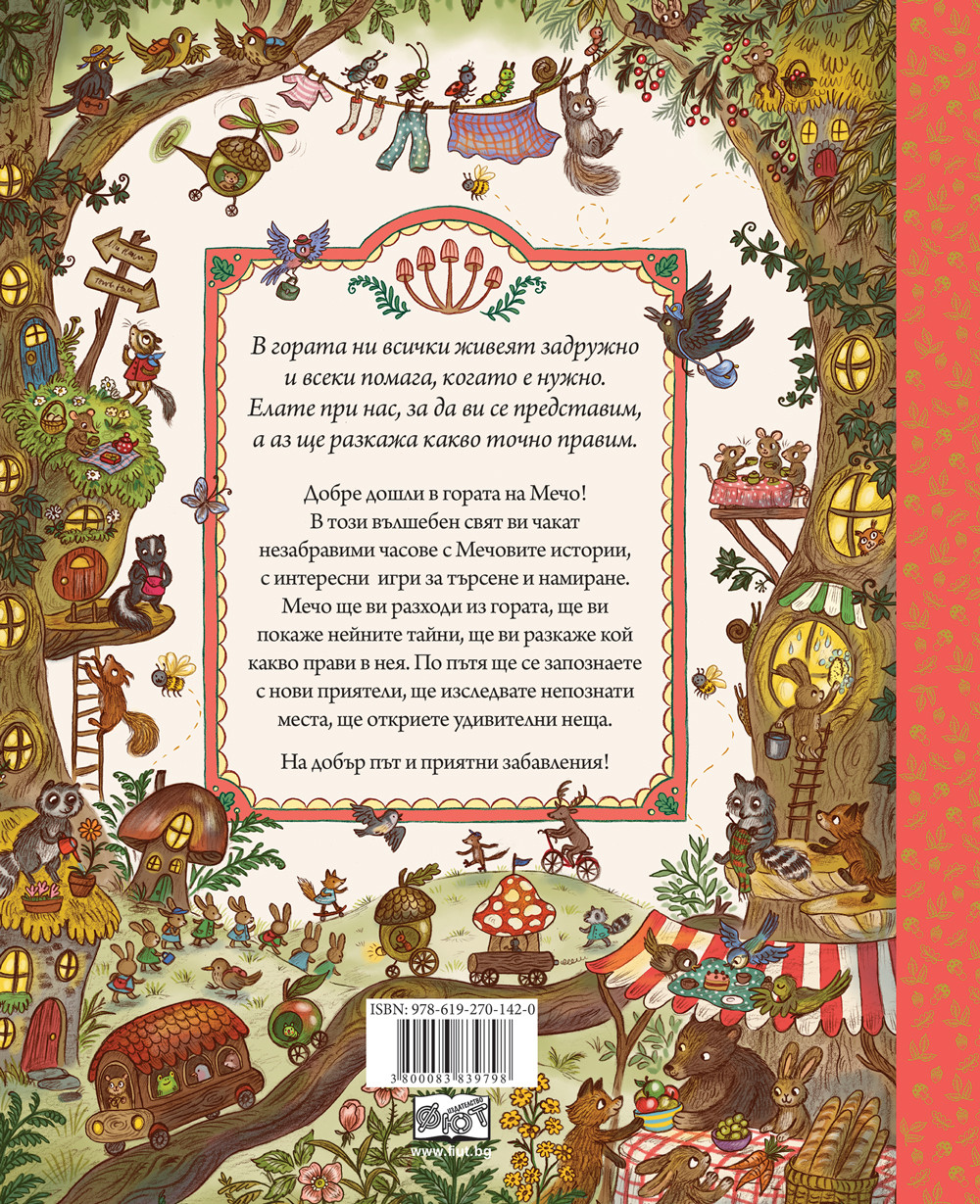 В този вълшебен свят ви чакат незабравими часове с Мечовите истории, с интересни игри за търсене и намиране. Мечо ще ви разходи из гората, ще ви покаже нейните тайни, ще ви разкаже кой какво прави в нея. По пътя ще се запознаете с нови приятели, ще изследвате непознати места, ще откриете удивителни неща.
