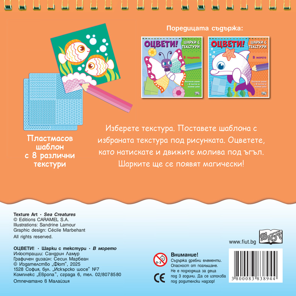 Възраст 4, 6 Страници 36 Формат 220х220 Техническа характеристика цветна + пластмасов шаблон с 8 текстури за различни шарки