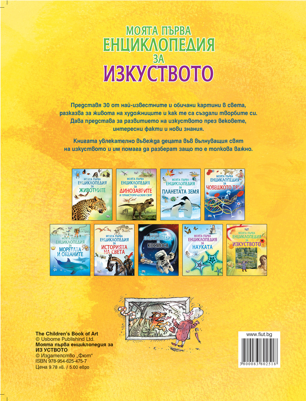Енциклопедията запознава със световно известни художници от миналото и съвременността, представя техните най-прочути и обичани картини, разказва за живота на художниците и как те са създали творбите си. Книгата увлекателно въвежда децата във вълнуващия свят на изкуството и им помага да разберат защо то заема толкова важно място в живота на хората, да развият собствен вкус и критерии за красивото.