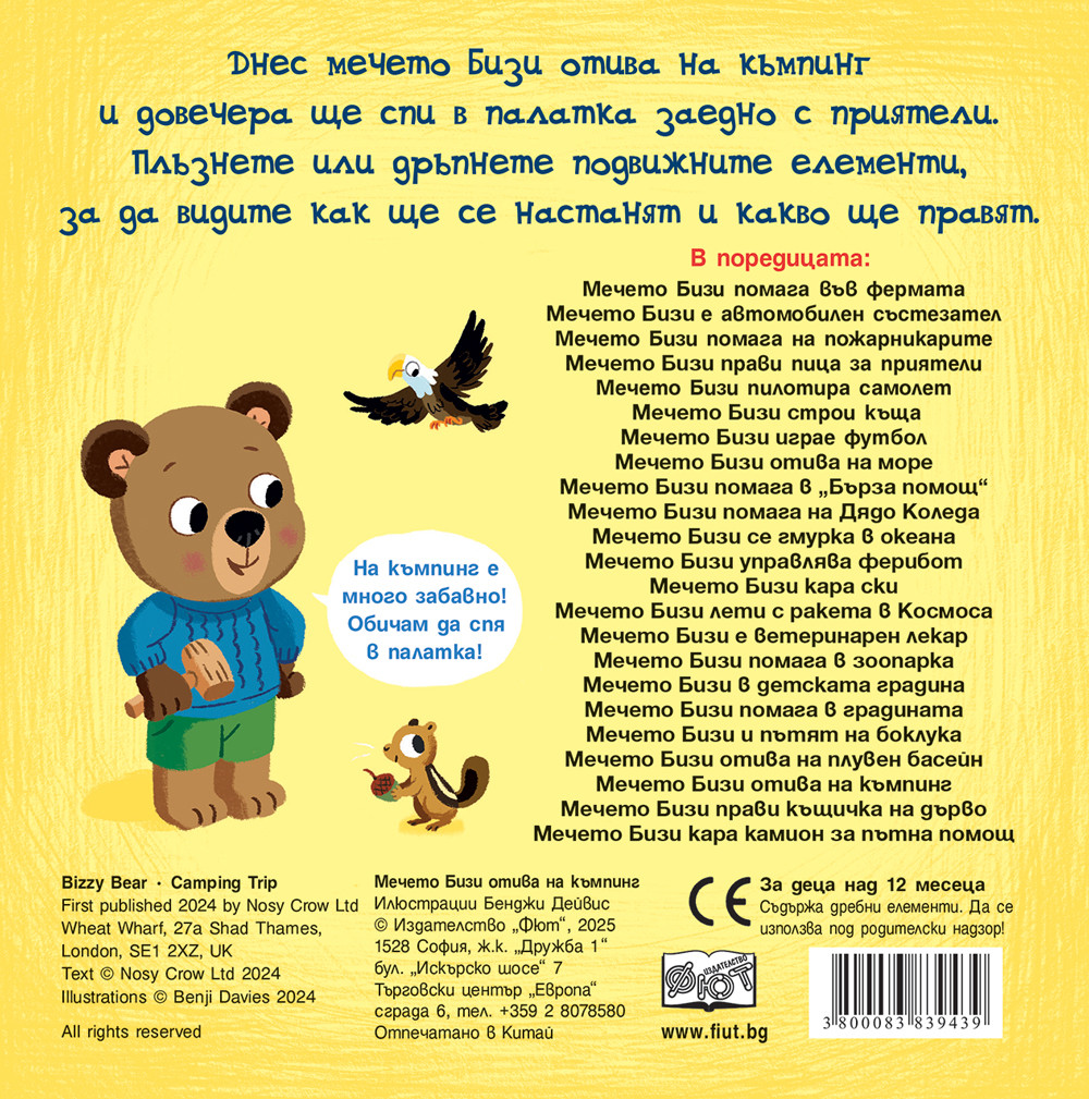 Днес мечето Бизи отива на къмпинг и довечера ще спи в палатка заедно с приятели. Плъзнете или дръпнете подвижните елементи, за да видите как ще се настанят и какво ще правят.