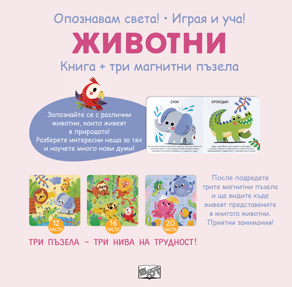Възраст 3, 5 Страници 10 Формат Кутия 194х194х30 мм; книжка: 190х190мм Техническа характеристика Магнитни пъзели: с 12, с 16 и с 20 части