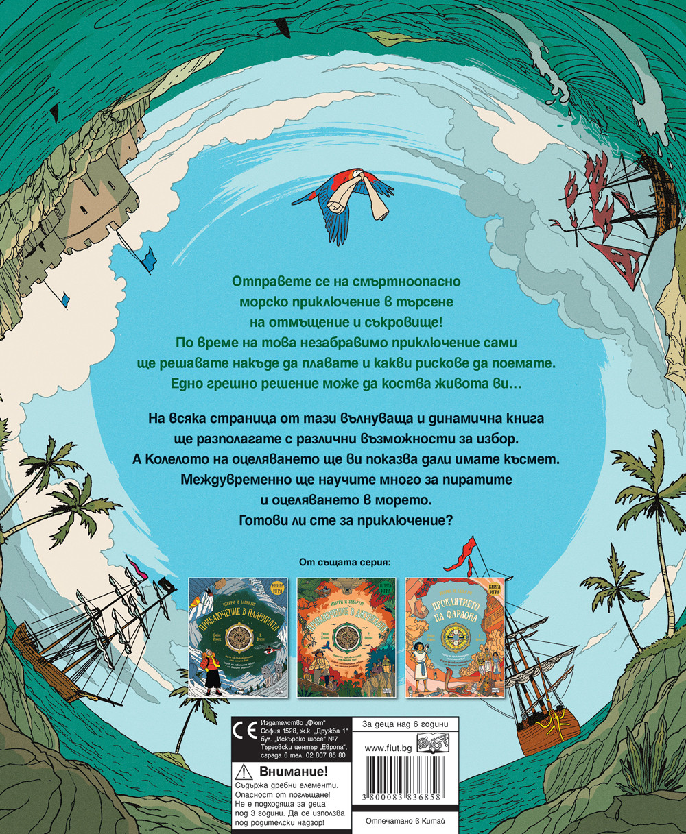 На всяка страница от тази вълнуваща и динамична книга ще разполагате с различни възможности за избор. А Колелото на оцеляването ще ви показва дали имате късмет. Междувременно ще научите много за пиратите и оцеляването в морето. Готови ли сте за приключение?