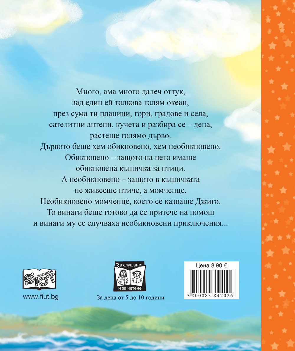 Много, ама много далеч оттук, зад един ей толкова голям океан, през сума ти планини, гори, градове и села, сателитни антени, кучета и разбира се – деца, растеше голямо дърво. Дървото беше хем обикновено, хем необикновено. Обикновено – защото на него имаше обикновена къщичка за птици. А необикновено – защото в къщичката не живееше птиче, а момченце. Необикновено момченце, което се казваше Джиго. То винаги беше готово да се притече на помощ и винаги му се случваха необикновени приключения...