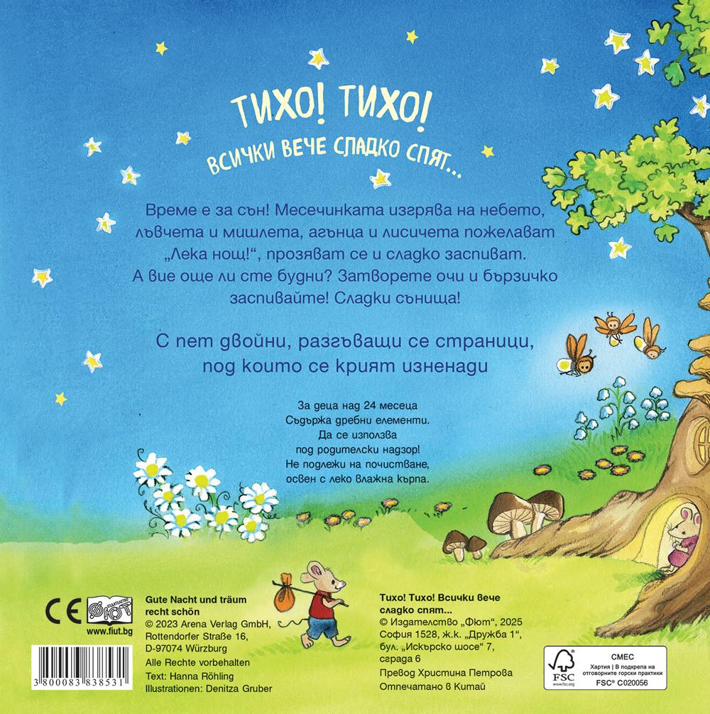 Римувана приказка за лека нощ с пет двойни, разгъващи се страници, под които се крият изненади