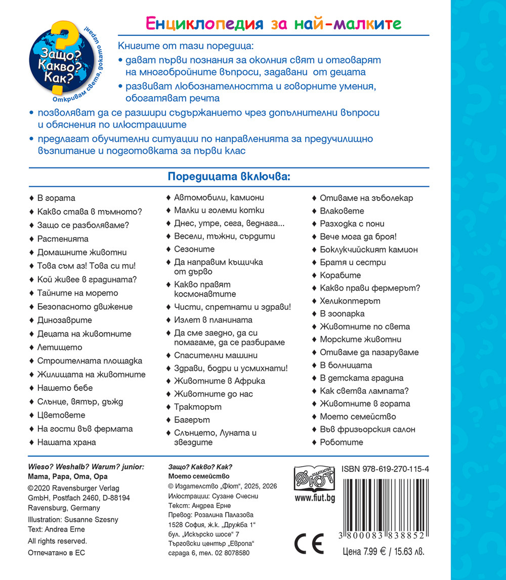 Възраст 2, 6 Страници 16 Формат 180х195 Техническа характеристика цветни, картонени, твърди корици + капачета